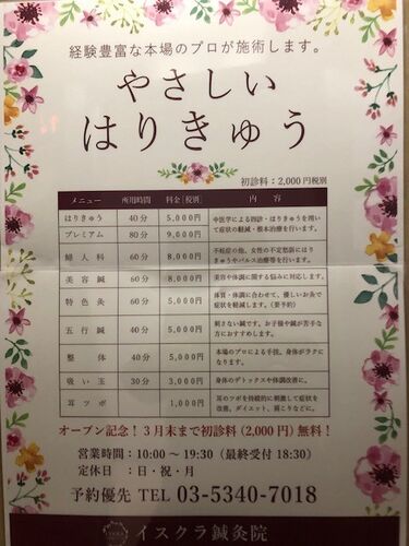 料金表ができました 整体の張先生は中国の有名な整体師について学んだ技術の素晴らしい先生です。中央線 中野駅下車すぐですのでご予約の上おいでください。